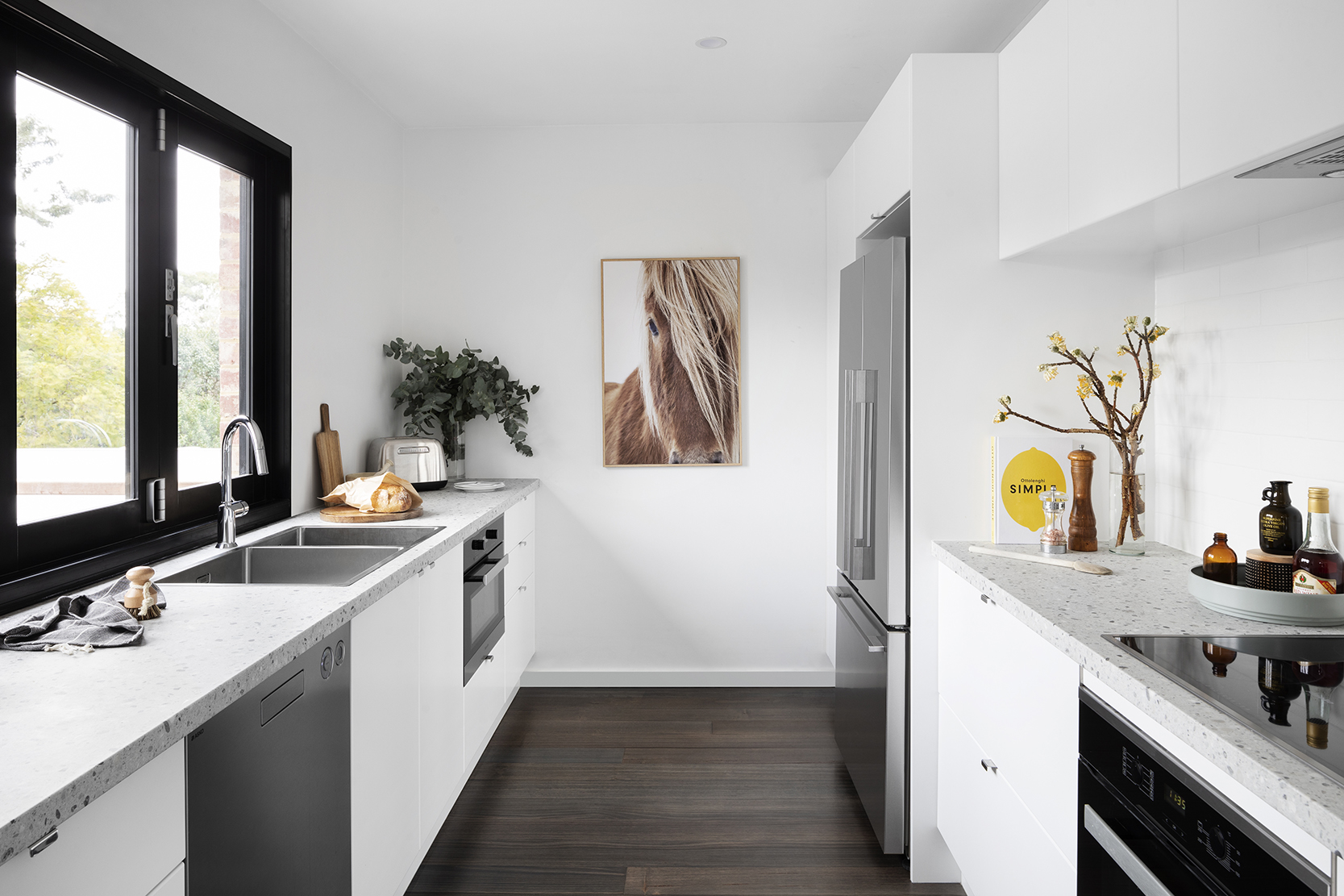The compact working triangle is one of the advantages of a galley kitchen – the design makes it stress free when you’re preparing food as you don’t have to move about a great deal. Appliances, storage space and an abundance of benchtop space are all within a few steps of each other.
