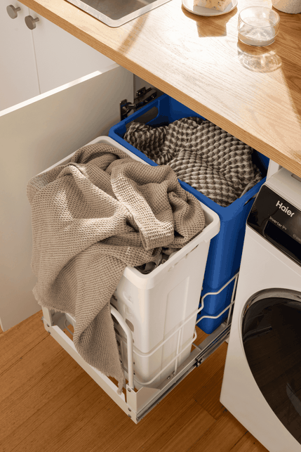 The 1 x 35L base mount laundry hamper is designed to fit a minimum 300mmm kaboodle cabinet. Sliding effortlessly on full extension soft close ball bearing slides, operation is made even easier thanks to a rigid, easy to reach pull handle.