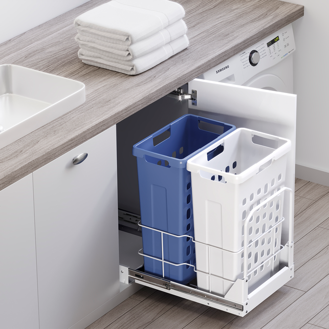 Our 2 x 35L side mount laundry hamper is designed to fit a 450mm cabinet with a large total capacity of 70L across two hampers. The unit is soft close and features 1 white and 1 blue hamper making washing sorting a breeze.